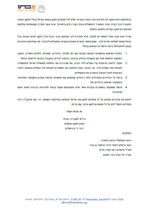 במכתב, שנשלח בערב חג סוכות, שיבחו הארגונים את עבודת המשטרה בהר הבית ואת ההתקדמות שנרשמה בשנה האחרונה בכל הנוגע לתפילת יהודים במקום, אך התריעו על אירועים חמורים שאירעו ביום הכיפורים האחרון. בין היתר דווח על בידוקים משפילים בכניסות, החרמת דפי תפילה מידי מתפללים באמצע תפילה, מעצרים של עולים ביום הקדוש והרחקות מנהליות לא חוקיות.